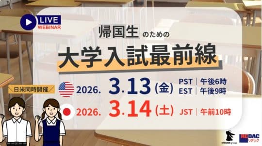帰国生のための大学入試最前線|3/13(金)21:00EST/3/14(土)10:00JSTオンラインセミナー開催