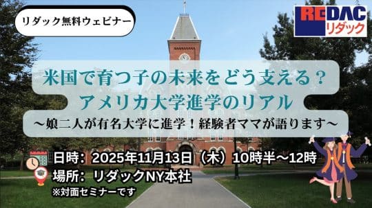 そこで今回、アメリカの有名大学に通う子供2人の親であるリダックスタッフが、アメリカの大学に行くために必要な準備について実体験を元に話すセミナーを企画しました。少人数のざっくばらんな対面セミナーです。お気軽にご参加ください。