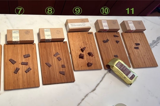 お店につくと、奥のカウンターに通されて、口直し用のお水が配られます。その後チョコレートに使用しているカカオの産地や製造工程の説明の動画を見終わると、いよいよテイスティング開始!