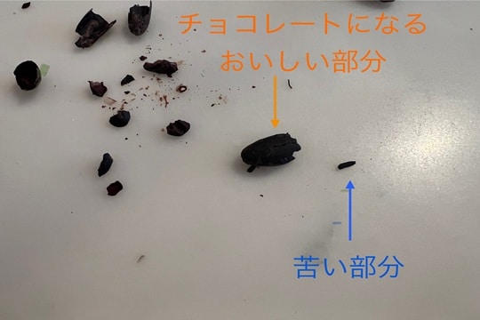 まずはチョコレートに使用しているカカオ豆を試食。自分で皮を剥くと(剥き方は殻を割るに近い)、非常に小さいかけら1つだけ取り出し、この部分だけは苦味があっておいしくない部分なので、チョコレートの製造時には取り除くとの説明を受けました。そのうえで、その取り除く部分と、その他のチョコレートになる部分の食べ比べをしました。確かに味がとても違い、この小さなかけらを入れるかどうかでチョコレートの質が変わってしまうことに納得がいきましたし、この後こだわり抜いて作られているチョコレートを食べられるという期待感がさらに高まりました