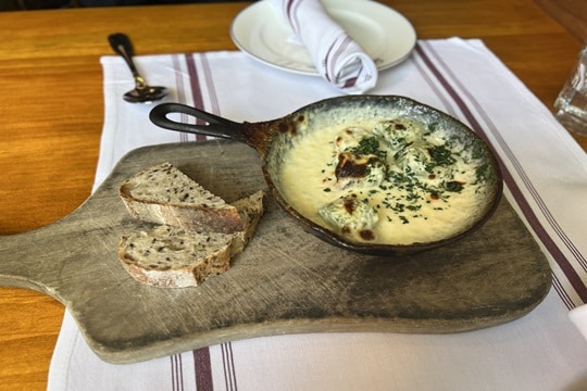 本格的なヨーロッパ風ビストロで、2019年と2021年にミシュランに掲載されています。地元の旬の食材をベースとした現代的なフランス料理とイタリア料理を提供しているレストランです。土曜日のランチ開店時間ちょうどに訪問すると、お店の外にすでに行列ができていました。予約なしで訪問してしまったので焦りましたが、店内が広いのですんなり入ることができました。ただ、私たちが入店して20分ほどで満席になっていたので、開店時間頃に訪問するか事前に予約しておくのが良いと思います。私たちは写真の3品を注文しました。