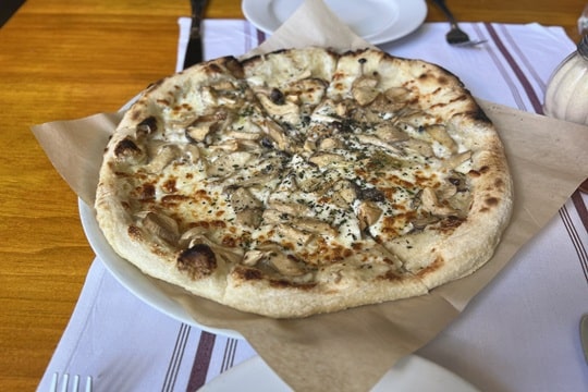 たっぷりきのこのピザ。マッシュルーム、モッツァレラチーズ、タイム、キャラメライズドオニオンピューレの上に、トリュフオイルがかかっています。周辺地域できのこの生産が盛んとのことだったので注文しましたが、とてもおいしかったです☆