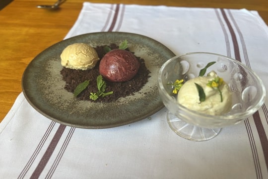 季節によって内容が変わるようですが、私たちが訪問した際は、塩キャラメル、アップル、ミックスベリーの3種類でした。アレルギーの関係でアップルだけ別のお皿に分けてもらいましたが、通常は3つとも同じお皿に盛って提供されます。