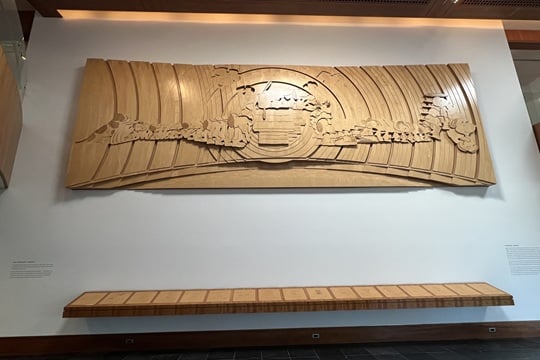 こちらも大谷さんが手掛けた作品です。この彫刻は43層のメープル材のべニア板で作られ、長さ792cm、高さ289cm、奥行き27cmもあります。この作品のベースはシュルツさんの幼少期のペットであり、スヌーピーのインスピレーションとなったスパイクで、1950年代から1990年代にかけてのスヌーピーの進化を強調しています。当初は切り紙の層で表現されたオリジナルの3次元のデザインを、この3,175kgの板に彫刻するには、2年以上かかったとされています。