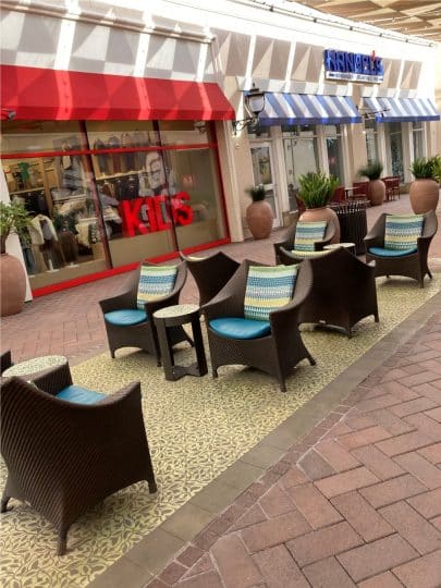 モール内の通路にはいたるところにテーブルとイスが設置されているので、休憩を挟みつつ、プレッツェル屋さんや、レストランに入らなくても手軽に食べられる飲食店も豊富です。