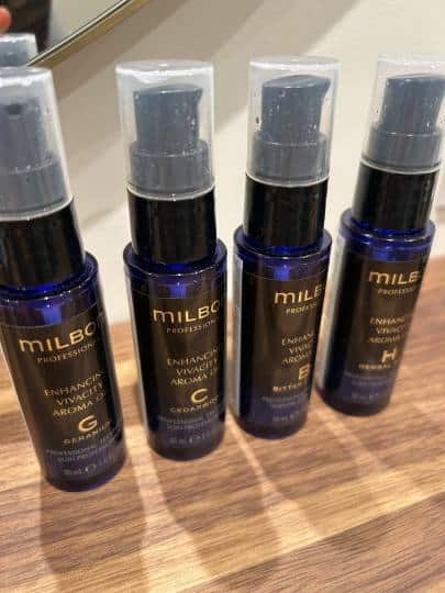 自分でも毎日きちんと洗えているのか〇十年生きていても謎だったので、今日で長年の汚れを一旦リセットできることを期待!頭皮チェック後には、ヘッドマッサージに使うホホバオイルに垂らすアロマを選びます。癒し系、エナジー系など、その日の気分に合わせて選択できます。さて、ついにヘッドマッサージの部屋へ移動!