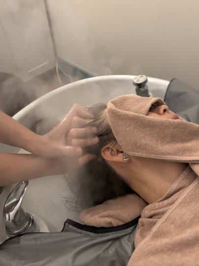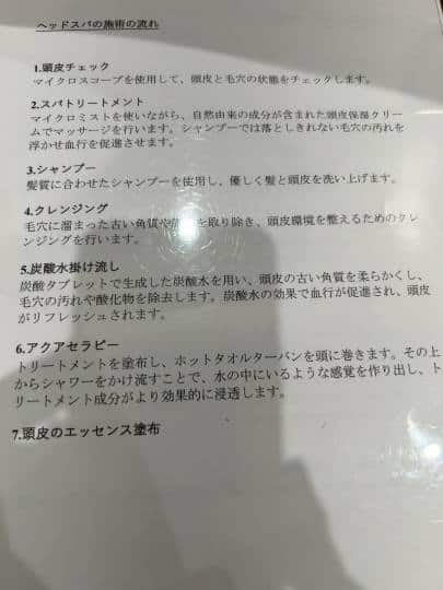 ゆっくりと時間をかけて、ヘッドマッサージ→シャンプー→クレンジング→炭酸水かけながし→アクアセラピー→頭皮にエッセンスを塗布、と日頃全く労われていない頭部をほぐして、根本から綺麗にして頂き、70分間でだいぶ若返ったような気分(頭部だけですが、笑)になりました。というか、途中からあまりの気持ちよさにうとうとしてしまい、記憶がとびとびだった、というのが正直なところ。最後、肩のマッサージをして頂き終了。尚、シャンプーやトリートメントは日本人の髪質に合うよう、日本から取り寄せているとのことでした。こちらのヘアケアが合わないという方にも安心ですね!