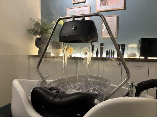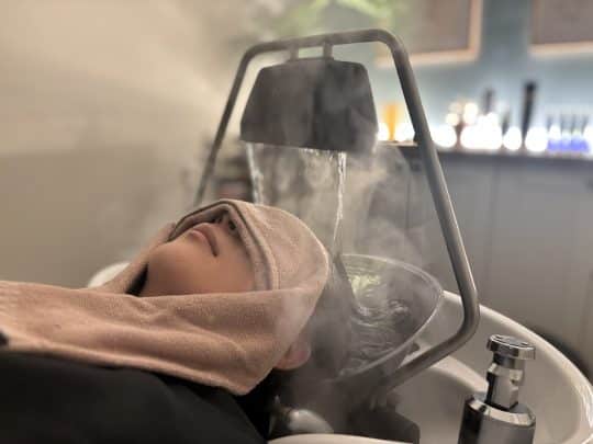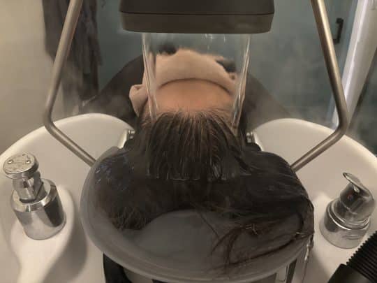 3つの香りから好きな香りをひとつ選んだら、ヘッドスパ 専用の個室に移動して、早速施術開始。頭皮のマッサージ→シャンプー→クレンジングと進んで、いよいよ今回の施術体験の目玉、「頭浸浴」へ。私は今回初めて知った単語なのですが、ざっくりと言うとその名の通り、「頭をお湯に浸す」施術です。たっぷりの炭酸のお湯に、わずか5分間、フェイスラインからの掛け流し&浸け込みだけで、リラックスしながら頭皮・髪の汚れをリセットすることができます。