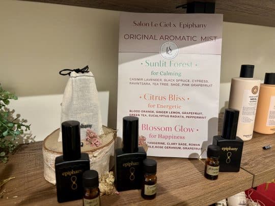 頭皮や髪についての悩みも聞いてもらいながら、カウンセリングの最後に施術中に使う香りを選びます。オリジナルのアロマミストは、香りのブランドepiphany(エピファニー)とSalon Le Cielのコラボ商品だそうで、店頭でも購入できます。
