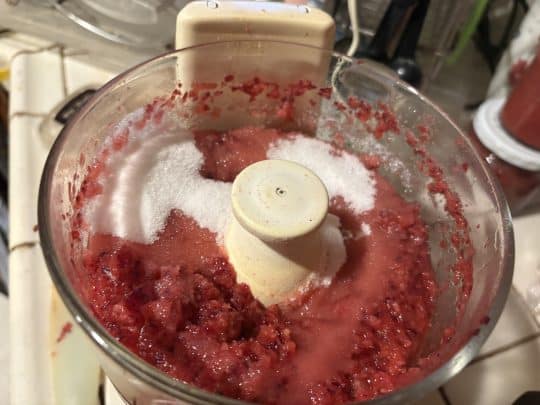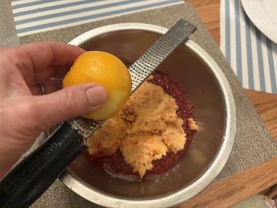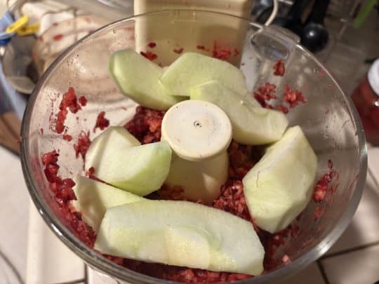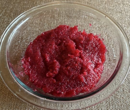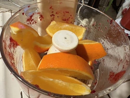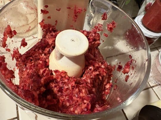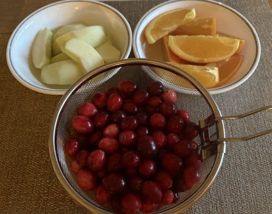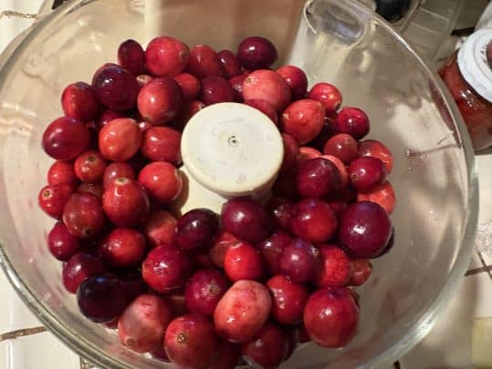 栄養価の高いクランベリー、オレンジ等を丸ごと使ったソースを作ります。火を通さないので、ビタミンCも破壊されないのが嬉しいですね。毎年多めに作って冷凍しておきます。ローストターキーやローストチキンに添えたり、クリスマスのハム、フルーツに添えたり、ケーキを焼く時に加えたりと、使い道は多々あり、役立つ一品です。