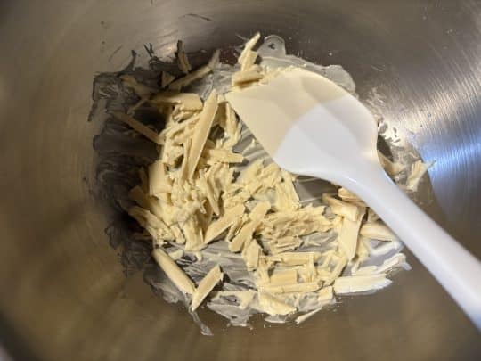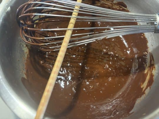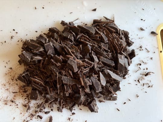 製菓用チョコレートとは、特にカカオバターが多く、溶かすと流動性が良く、美しい艶と口溶けが得られる「クーベルチョコレート」を指すようです。風味もよく、市販の板チョコに比べて余計な添加物が少なく、加工に適しています。今回は、トレーダージョーズにて約8ドルで購入しました。