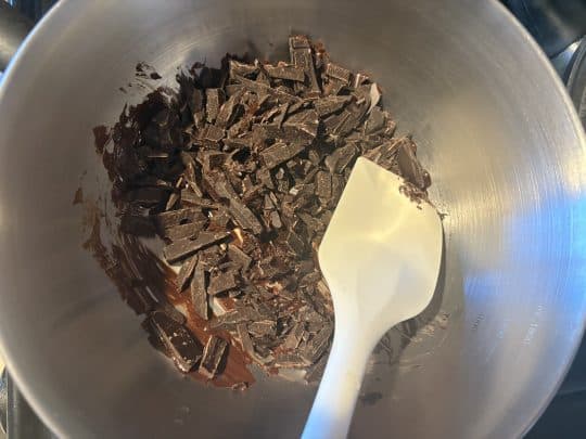 製菓用チョコレートを刻みステンレスのボールに入れ、バター、オリーブオイルも入れて湯せんで溶かす。