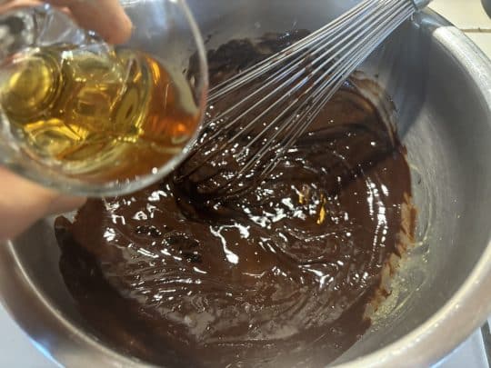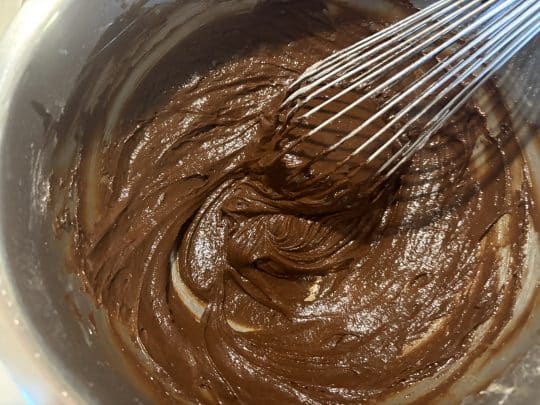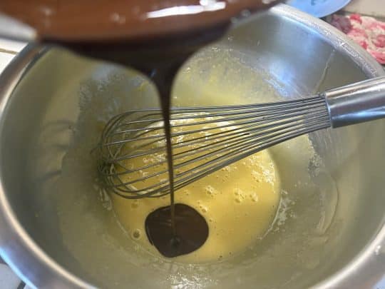 黄身の入ったボールに2/3の砂糖を加えて、泡立て器で白っぽくもったりするまでよく混ぜ合わせる。次に1のチョコレートを加えて混ぜ合わせ、更にラム酒を加えて混ぜ合わせる。