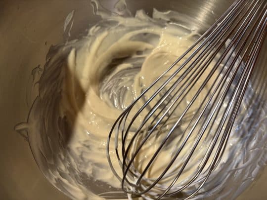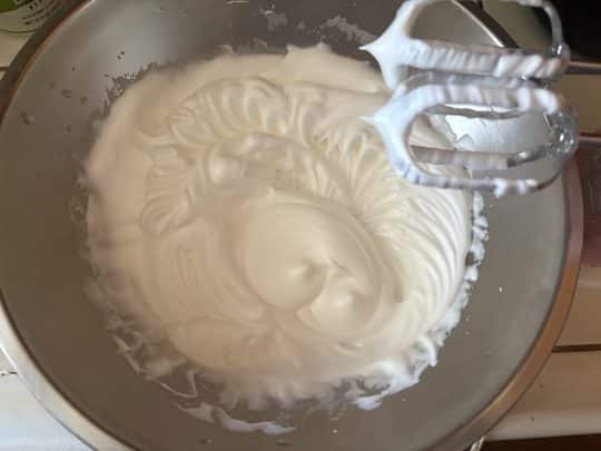 白身の入ったボールをハンドミキサーで泡立て、白身が少しふわふわしてきたら、残りの砂糖を全体に振り入れて、角がたつまでしっかりと泡立てる。