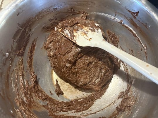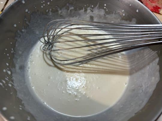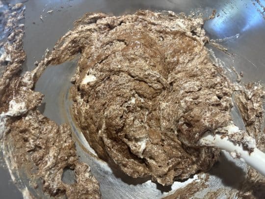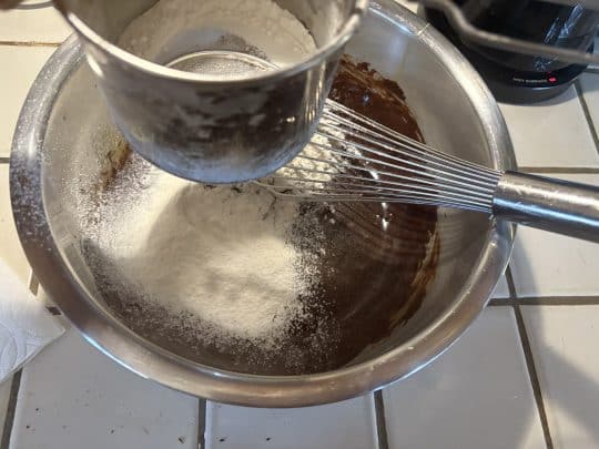 2にふるいながら粉を加えて粉が見えなくなるまで、混ぜ合わせる。