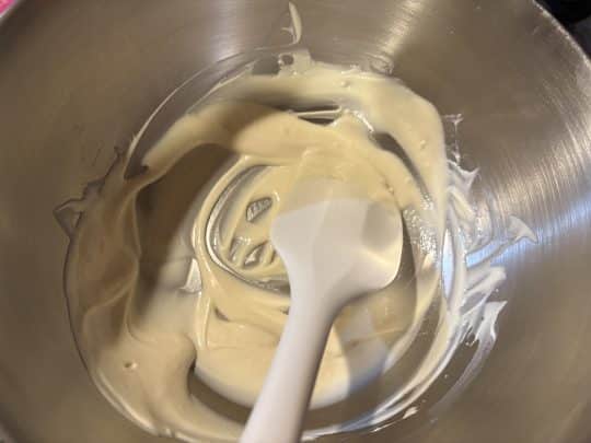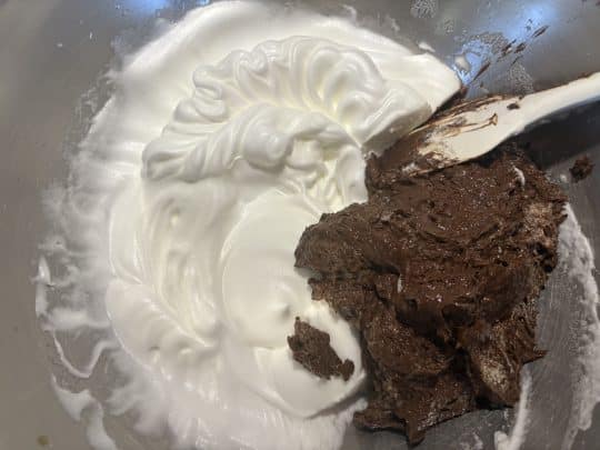 3に4のメレンゲを1/3加えて泡を潰さないようにゴムベラで上下に動かしながら、切るように混ぜ合わせる。