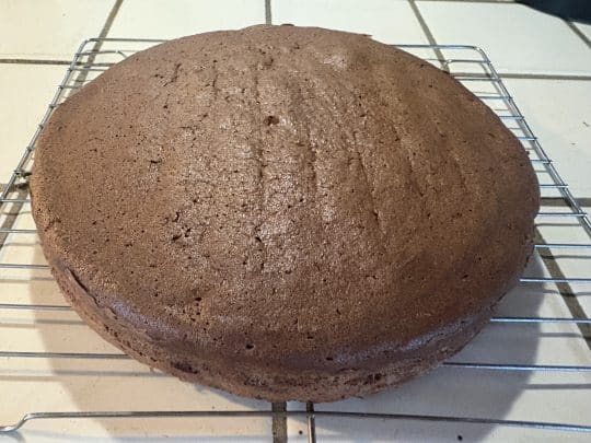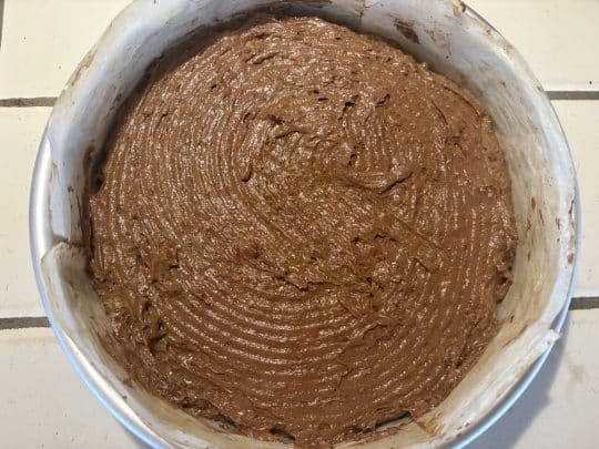 残りのメレンゲに5を加えて、泡を潰さないよう、ゴムベラをじょうげに動かしながら切るように混ぜ合わせ型に流して平らにし、余熱したオーブンで約25分位焼く。竹串をさして生地がつかないようなら焼きあがり。