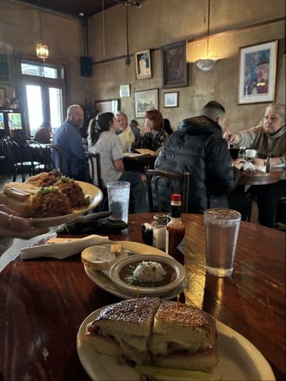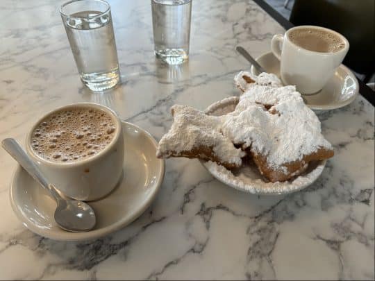 フレンチクオーターの端にCafe Du Mondeの本店があります。建物の横に大きなテントを張って店を拡張させものすごい数のテーブルがあるのですが、それでも休日の昼間に行くと大行列になっていて、小一時間並びました。ここはベニエが有名でドーナツの上に粉砂糖をかけて食べます。人が多くて掃除が行き届いてないのかテーブルの上も下も粉砂糖まみれになってました。本店で食べるからこそ価値があるとも思いますが、ミシシッピ川沿いのショッピングセンターの中にも同じ店が入っていて、そこでは並ばずに室内の暖かい室内で食べる事ができるので、本店の入り口だけ覗いてそっちで食べる、というのもありかもしれません。また、本店の近くにCafe Du Mondeのグッズ屋さんもあるのでぜひ行ってみてください。